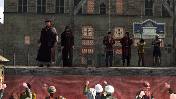 捕らえられた父、兄、弟を助けるために動き回るエツィオでしたが、その甲斐も虚しく父達は絞首刑に…。